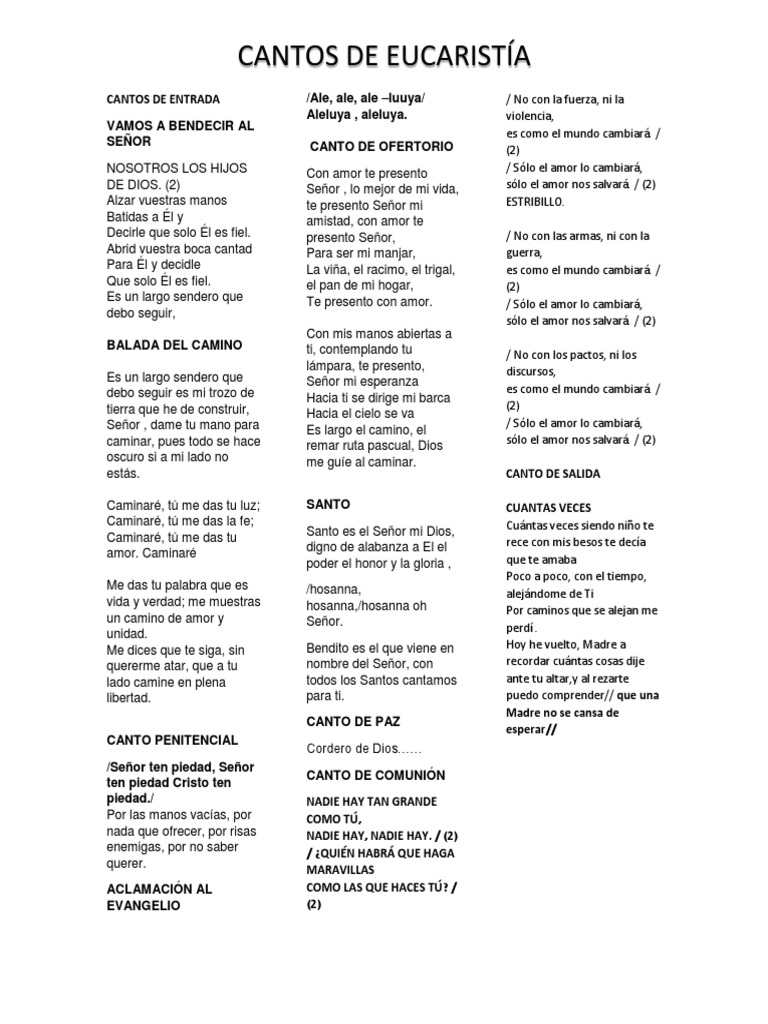 Cantos seleccionados para misas católicas con acordes y guia para tocarlos. Sugestão de músicas para missas de todos os dias. CANTOS PARA LA MISA DOMINICAL CANTOS DE ENTRADA Abran las Puertas Abre tu Jardín Alabado seas mi Señor Alégrate Jerusalén.