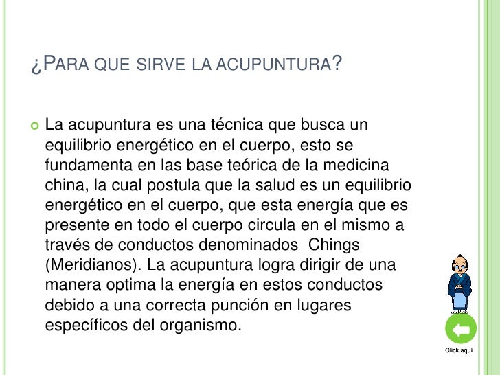 La acupuntura sirve para liberar un meridiano del cuerpo que se ha bloqueado y para restaurar el flujo correcto de energía del Qi. Problemas ortopédicos dolor ciático o artritis reumatoide. La Acupuntura es una técnica terapéutica basada en la Teoría de la Medicina Tradicional China consiste en la inserción de agujas finas de acero inoxidable desechables de un uso en puntos específicos de la superficie del cuerpo a diferentes profundidades según la zona y musculatura local permaneciendo en tiempo variable de 20 a 40 minutos en una frecuencia de 1 a 3 veces por.