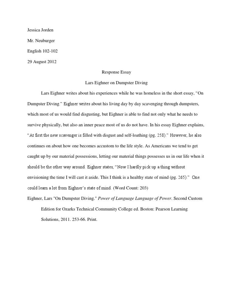 Eighner prefers being referred to as a scavenger rather than a dumpster driver. 102-101 30 January 2012 One Paragraph Essay Lars Eighner- On Dumpster Diving Lars Eighners On Dumpster Diving describes the experience of being homeless and having to dumpster dive for a living. Dumpster Diving More Than Just a Way of Life Surviving off dumpster diving is a very difficult but insightful way of life.