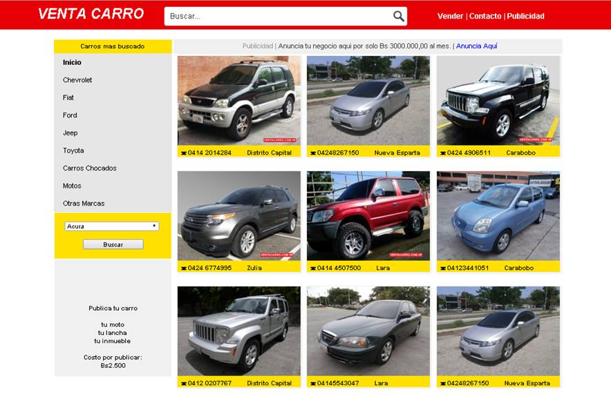 - Vehículos de todo tipo - Repuestos de vehículos - Servicios automotriz - Autoperiquitos REGLAS QUE DEBES CUMPLIR. Se venden vehículos en excelentes condiciones. TuCarro Venezuela Crea tu cuenta Ingresa Ayuda Publica tu vehículo Contacto.