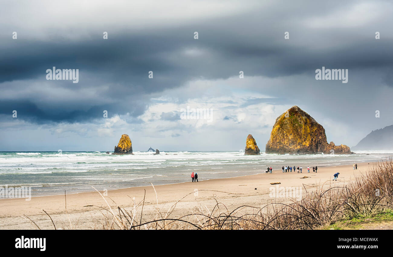 Cannon Beach Oregon Usa March 22 2009 Tourist And Residents Brave The Stormy Weather As They Comb The Shoreline Looking For Treasures Left Behind Stock Photo Alamy
